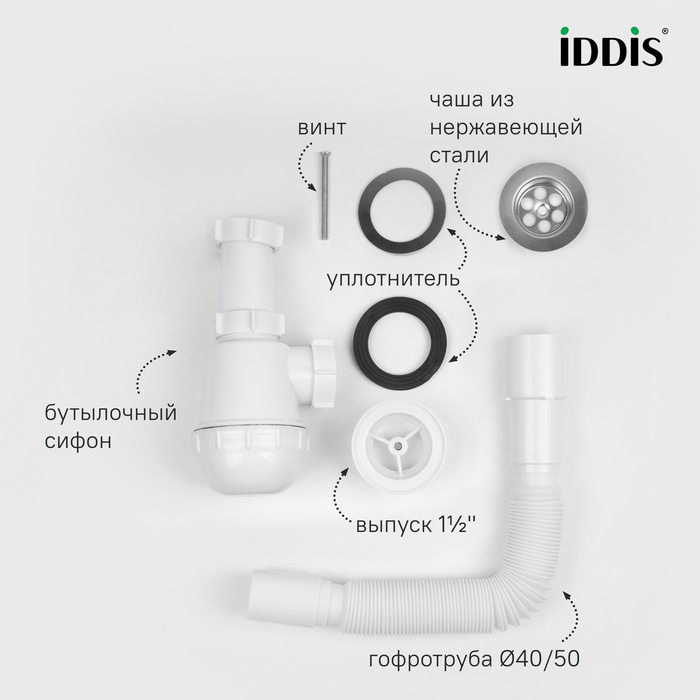 • В комплекте всё необходимое для быстрой и простой установки: гофротруба с диаметром подключения 40 или 50 мм за счет переходника.