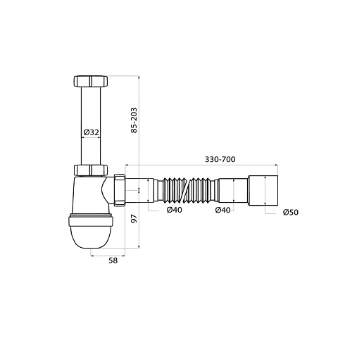 • Гофротруба длиной от 330 до 700 мм позволяет установить сифон без точной подгонки под канализационный вывод.