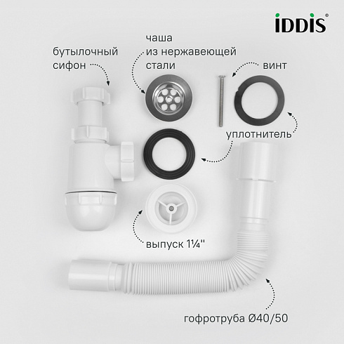 • В комплекте всё необходимое для быстрой и простой установки: гофротруба с диаметром подключения 40 или 50 мм за счет переходника.