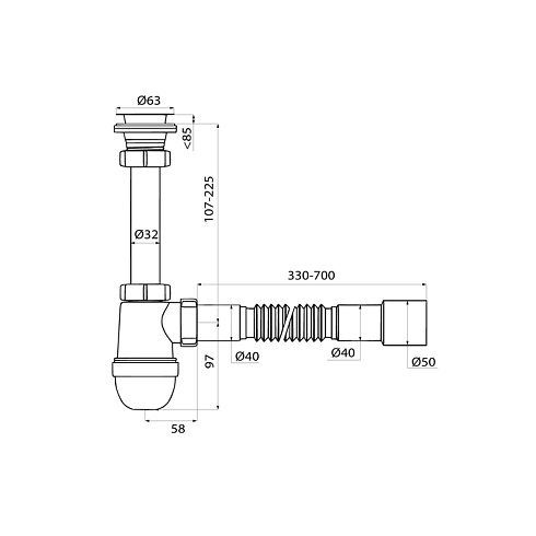 • Гофротруба длиной от 330 до 700 мм позволяет установить сифон без точной подгонки под канализационный вывод.