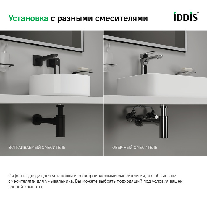 • Можно собрать готовое решение от IDDIS® в одном цвете: сифон, выпуск, смеситель и накладной умывальник, идеально совпадающие по тону. Это освежит интерьер, сделает его цельным.