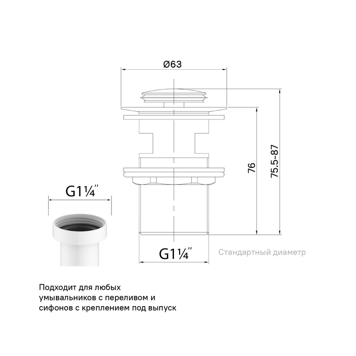 • Подходит для любых умывальников с переливом. Стандартный диаметр 1.1/4” подойдет для любых сифонов с креплением под выпуск.