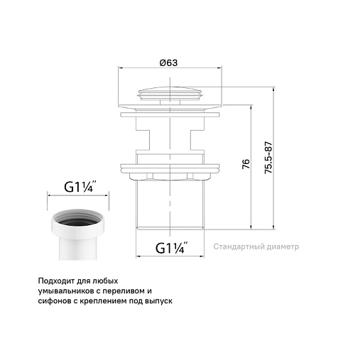 • Подходит для любых умывальников с переливом. Стандартный диаметр 1.1/4” подойдет для любых сифонов с креплением под выпуск.
