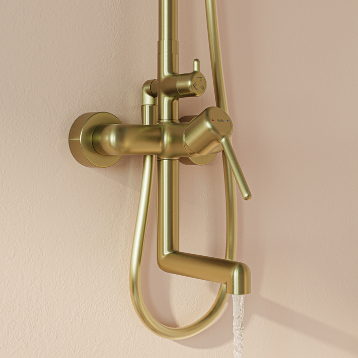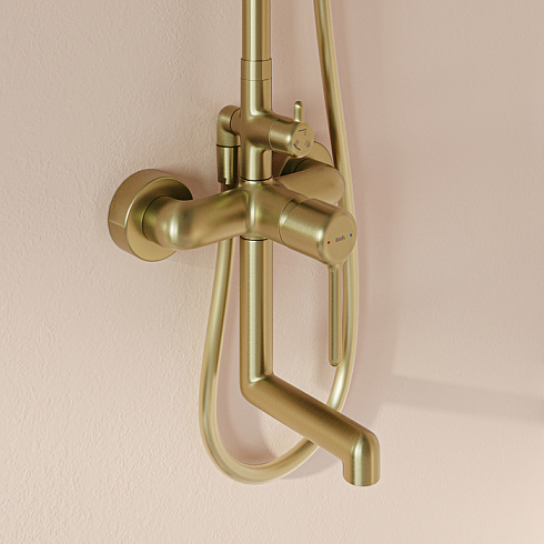 Стильная функциональная душевая система Aiger, где удачно сочетается актуальный современный дизайн и трендовый оттенок матового золота с брашированным покрытием. Тонкая удлиненная ручка добавляет смесителю изящества и комфорт в управлении.