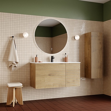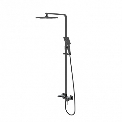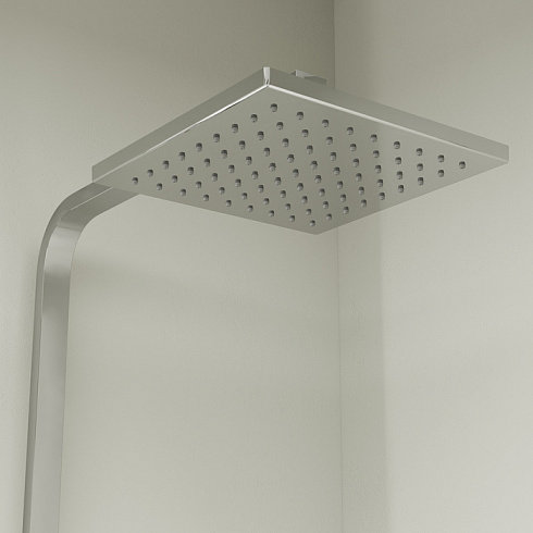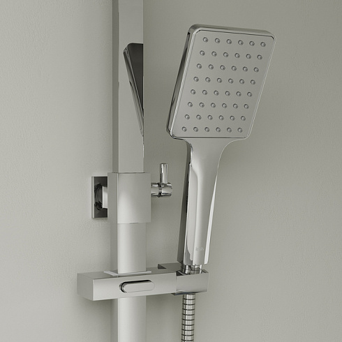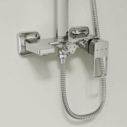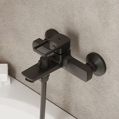 Смеситель для ванны Bild с верхним душем отличают выраженные геометрические формы и уникальный дизайн ручки-петли с тонкой изящной рамкой. Толщина рамки составляет всего 2 мм, при этом прочность ручки не снижается — она прослужит долгие годы. Излив эстетично интегрирован в корпус, вода из него поступает в ванну под комфортным углом. Стойка удобно регулируется по высоте.