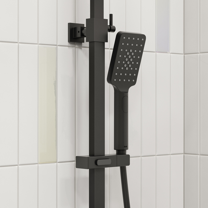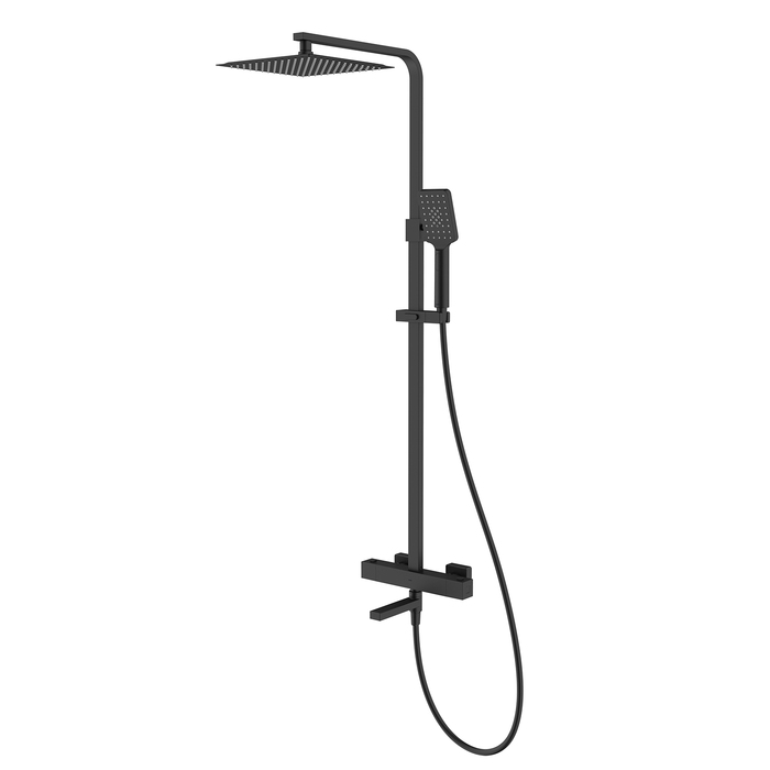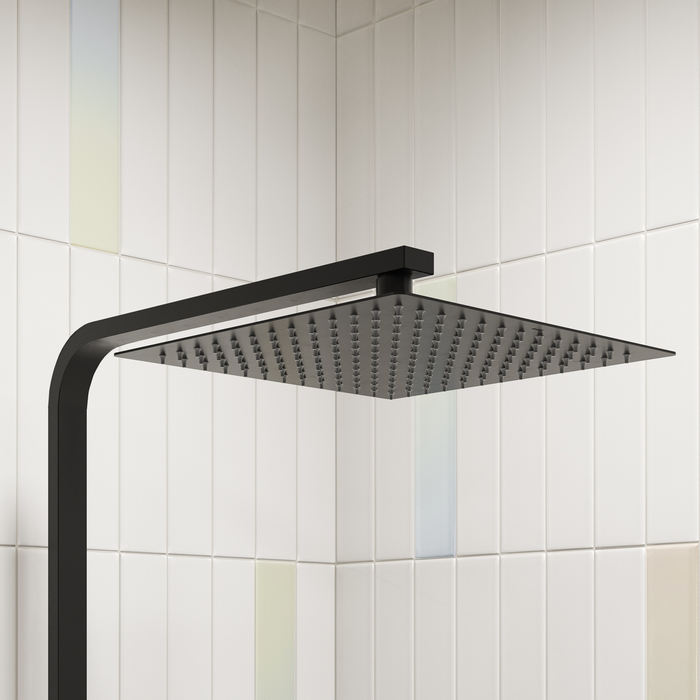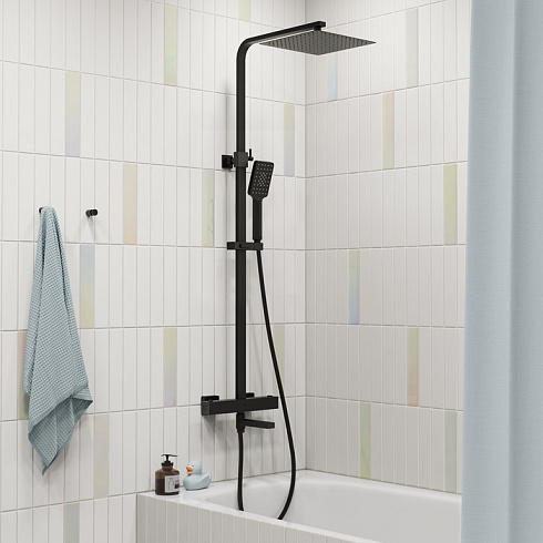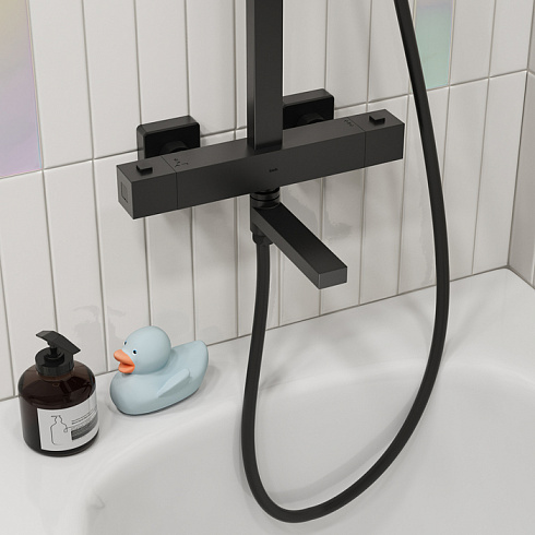 Термостат минималистичного дизайна в трендовом черном цвете с тропическим душем и изливом – современное решение, где объединены все нужные функции.
