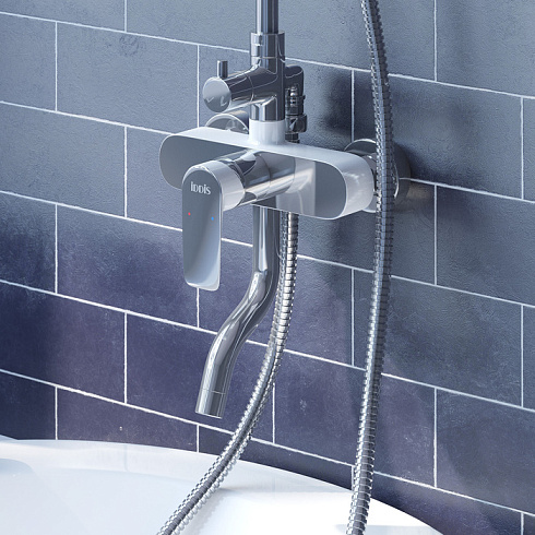 Смеситель для ванны из коллекции Cloud – воплощение легкости и простоты. Игра двух цветов — белого и хромированного — создает утонченный и стильный продукт, который подойдет к интерьеру в современном и классическом стиле. Наклон верхней лейки удобно регулируется с помощью шарнирного крепления – так, чтобы каждый член семьи мог настроить его под себя. В комплекте душевые аксессуары в тон смесителю: трехрежимная лейка с держателем и гибкий шланг (1,5 м) для душа в оплетке из нержавеющей стали с защитой от перекручивания.