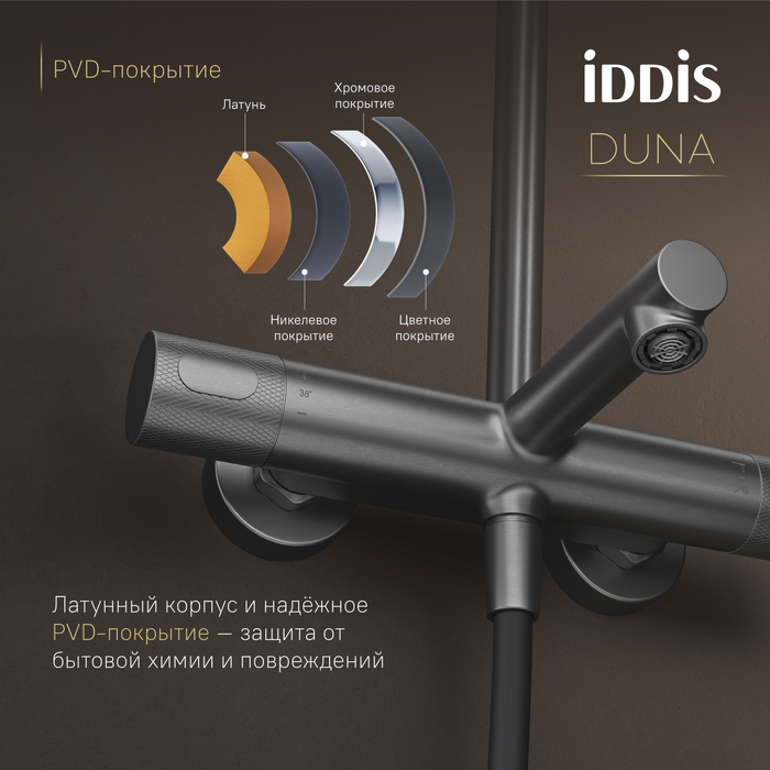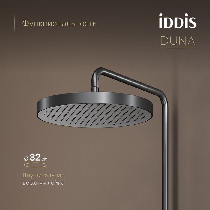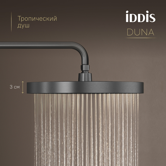 Душевая система с термостатом, тропическим и ручным душем и изливом Duna – воплощение актуальных трендов в дизайне смесителей в безупречном исполнении: фрезеровка, модные цвета и фактуры.