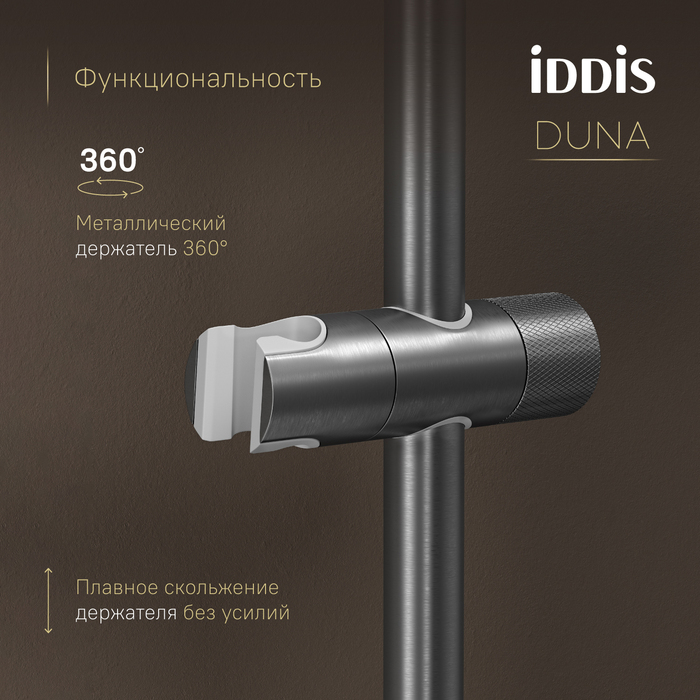 — Металлический держатель 360° регулируется по высоте и наклону, благодаря фрезерованной ручке фиксируется даже в мокрой руке. Пластиковая вставка предотвращает повреждение гайки шланга.