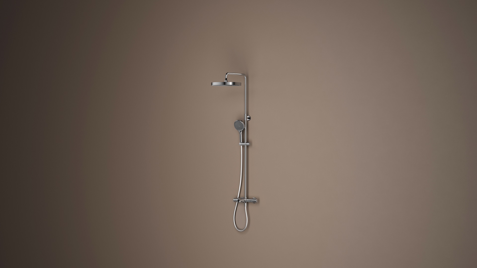 Душевая система с термостатом, тропическим и ручным душем и изливом Duna – воплощение актуальных трендов в дизайне смесителей в безупречном исполнении: фрезеровка, модные цвета и фактуры.