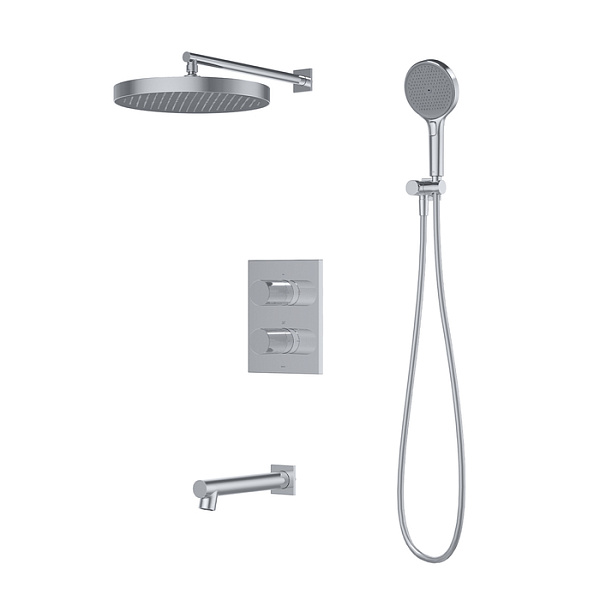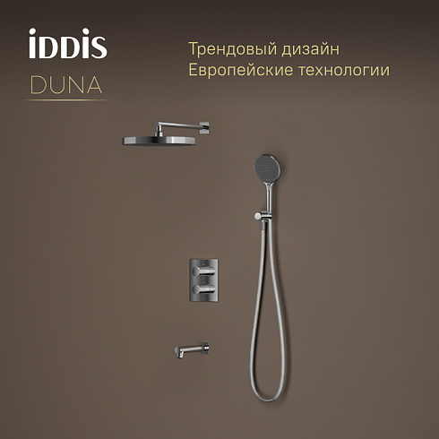Внешние элементы душевой системы Duna в универсальном хроме с верхним тропическим душем, ручной лейкой и изливом. Предназначены для комплектации встраиваемого смесителя с термостатом на три выхода UniCore.
