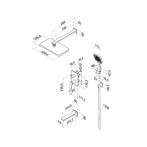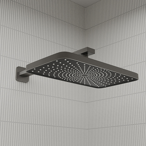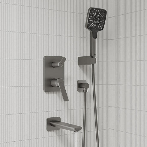 Встраиваемая душевая система Parker в матовом графите - практичная и стильная, ее дизайн сочетает в себе трендовый минимализм форм и четкие грани.Готовый комплект включает всё необходимое для создания уютного и функционального пространства: смеситель, верхняя лейка с кронштейном для тропического душа, настенный излив, большая ручная лейка с 3 режимами, душевой шланг 1,5 м и выход для подключения шланга с держателем.