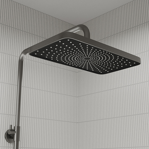 Душевая система Parker в матовом графитовом цвете с тропическим душем – практичная и стильная, ее дизайн сочетает в себе трендовый минимализм форм и четкие грани. Ручка изящно смотрит вверх под углом, освобождая под собой место для более удобного захвата. Необычный рисунок из форсунок на лейках в виде паутинки превращает душевую систему в красивый акцент ванной.