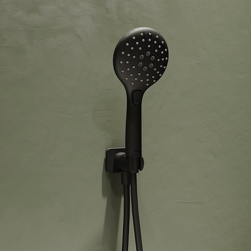 • Оптимальная подборка сантехники Ray: смеситель, верхняя лейка с кронштейном для тропического душа, большая ручная лейка с 3 режимами, душевой шланг 1,5 м и выход для подключения шланга с держателем для лейки.