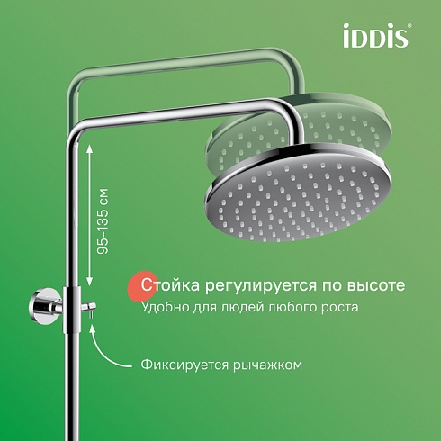 • Регулируемая высота стойки (от 800 до 1350 мм) позволяет принимать душ с комфортом даже самым высоким.
