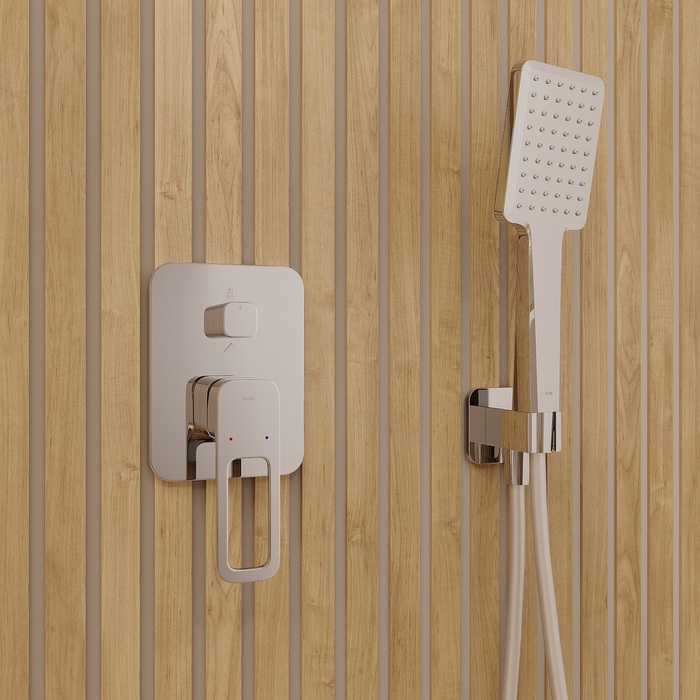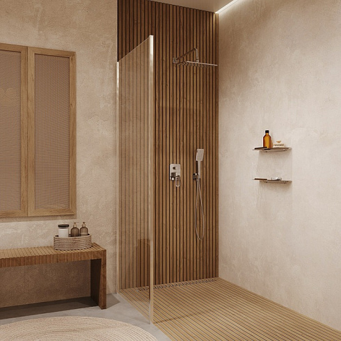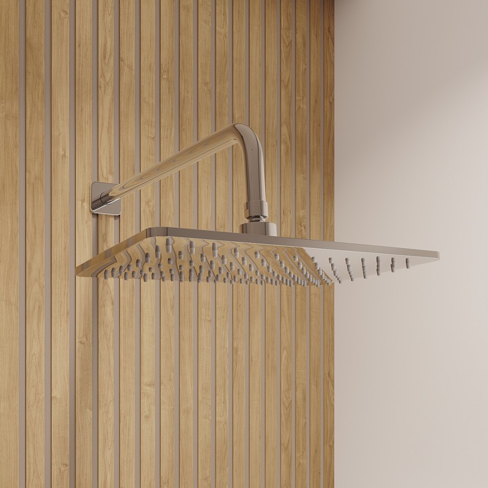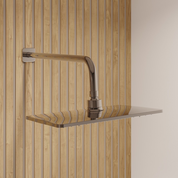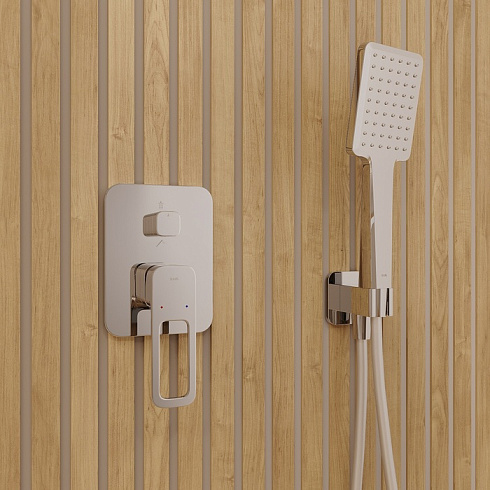 Оптимальная подборка сантехники Slide: смеситель, верхняя лейка с кронштейном для тропического душа, ручная лейка, душевой шланг 1,5 м и выход для шланга с держателем для лейки.