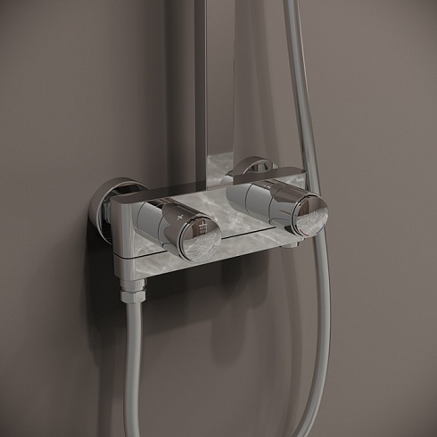 • Две ручки-кнопки обеспечивают полный контроль над управлением всеми функциями смесителя. Правая включает-выключает смеситель нажатием на кнопку и регулирует температуру воды при повороте вправо-влево. Левая позволяет настроить нужный напор воды – уникальная функция, обычно в смесителях с кнопочным управлением напор воды стандартный и не регулируется. Левая кнопка также переключает поток воды между верхней и ручной лейкой одним нажатием.