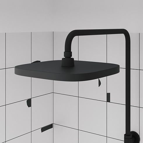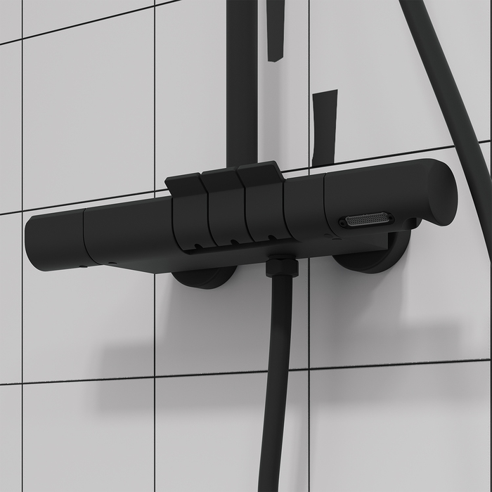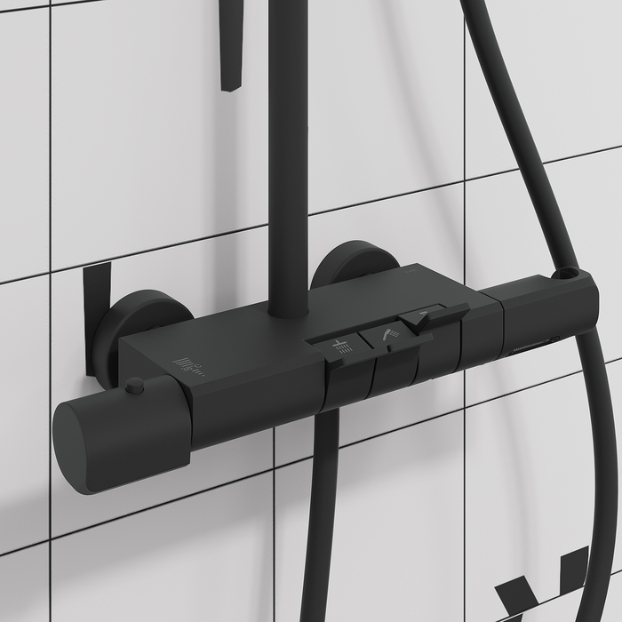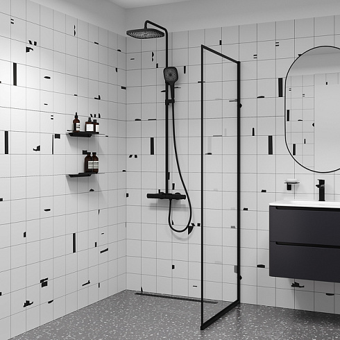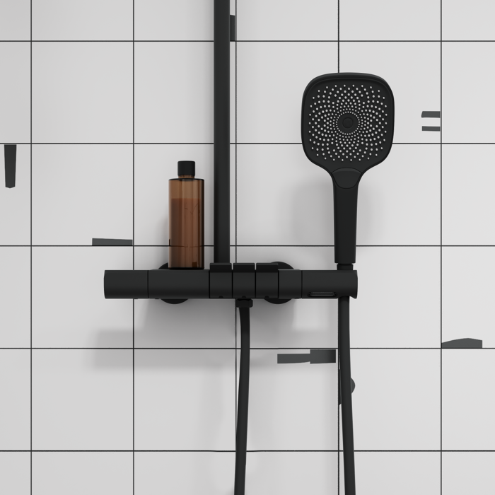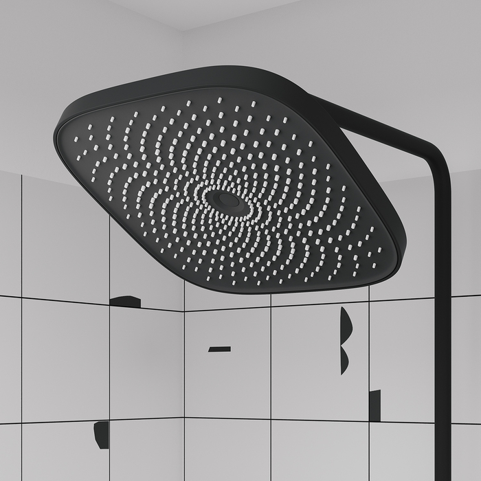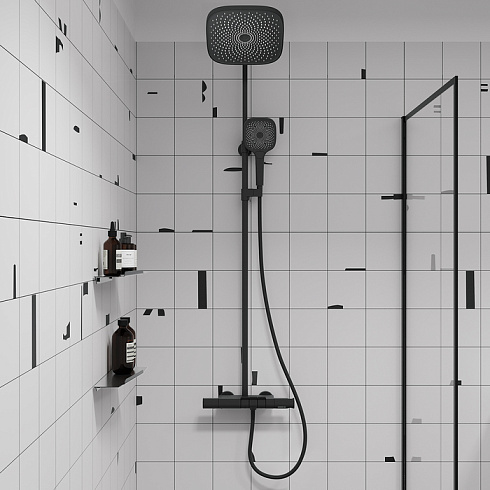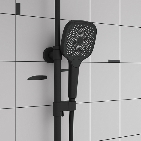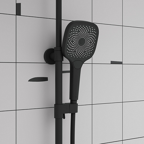 Современная душевая система SpaHome в трендовом черном цвете, где собраны топовые технологии для самого комфортного принятия душа и ванны: клавишное управление, термостат, тропический верхний душ, большая ручная лейка, излив.