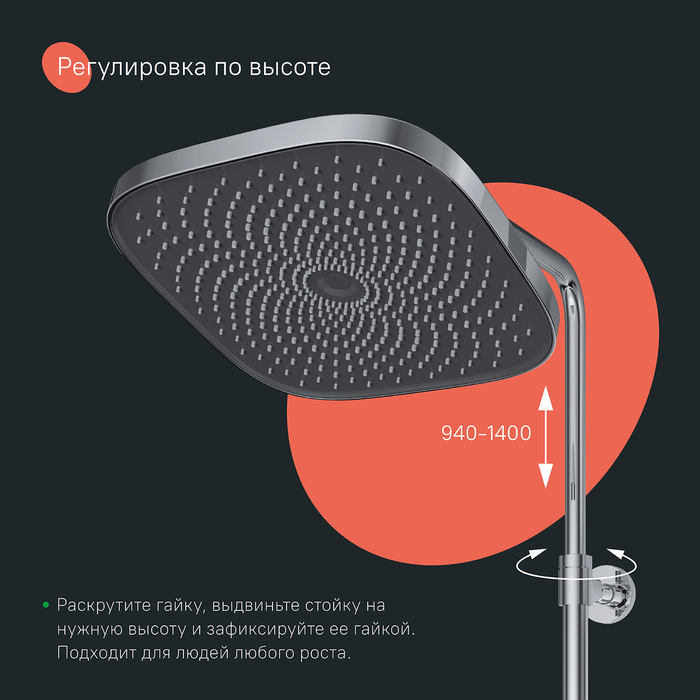 • В комплекте: верхняя лейка 260х260х65 мм, ручная лейка с 3 режимами 270х125 мм, гладкий душевой шланг 1,5 м.
