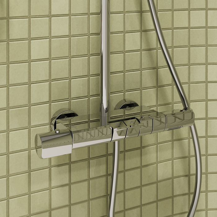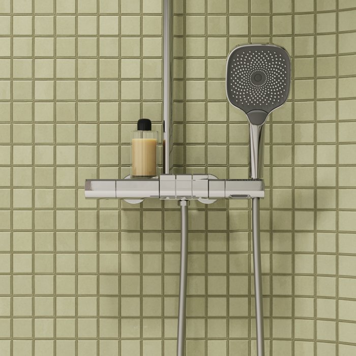 Современная душевая система SpaHome, где собраны топовые технологии для самого комфортного принятия душа и ванны: клавишное управление, термостат, тропический верхний душ, большая ручная лейка, излив.