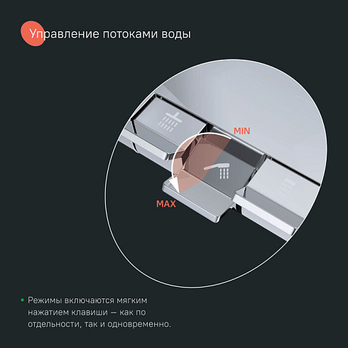 • 3 выхода для воды: излив, верхняя лейка, ручная лейка. Каждый из них включается мягким нажатием клавиши – как по отдельности, так и одновременно.