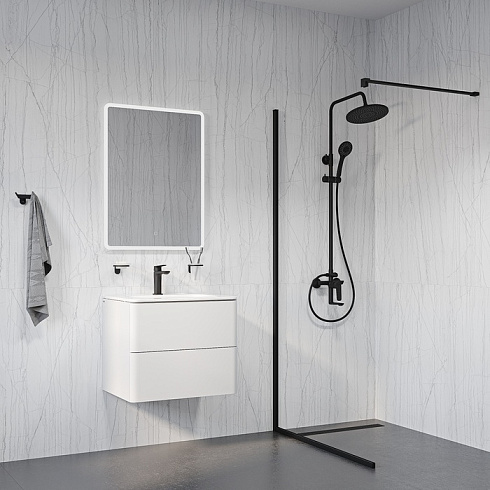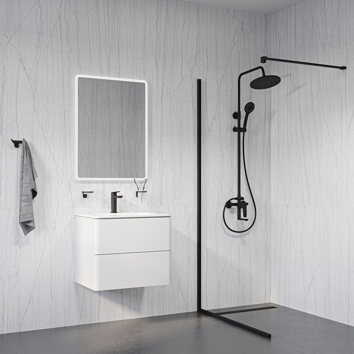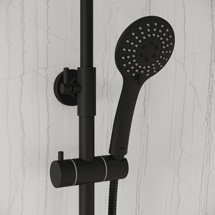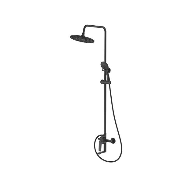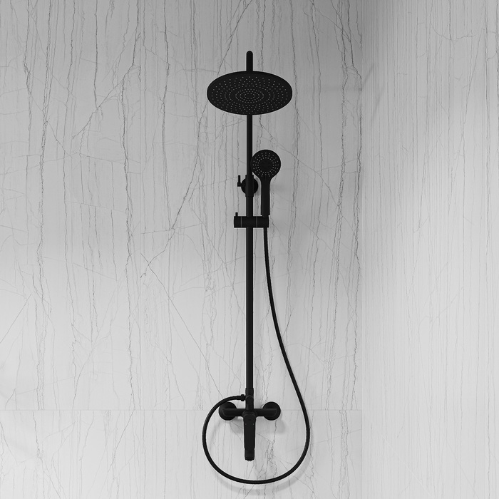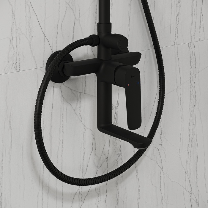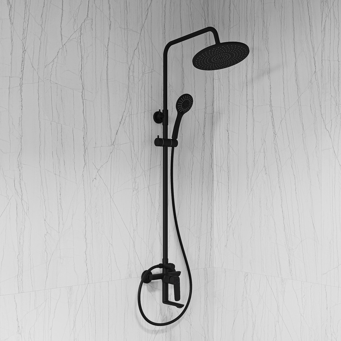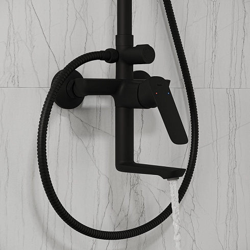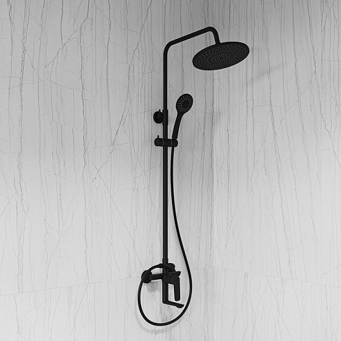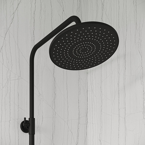 Душевая система универсального дизайна в стильном матовом черном цвете с плавной геометрией линий подойдет к интерьеру и в классическом, и в современном стиле. Монтируется на стену.