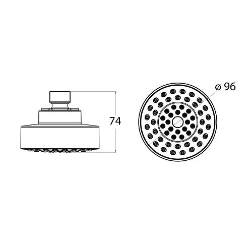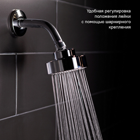 Компактная (диаметр – 96 мм) душевая насадка для душевой зоны небольшого размера. Продуманное строение форсунок обеспечивает комфортный напор воды в верхней лейке даже при минимальном давлении воды. Шарнирное крепление позволяет удобно отрегулировать положение лейки.