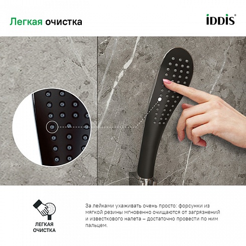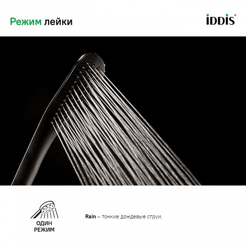• Лейка для душа IDDIS® имеет классический режим подачи воды Rain и легко очищается от известкового налета благодаря системе Easy Clean с эластичными форсунками – достаточно провести по ним подушечкой пальца.