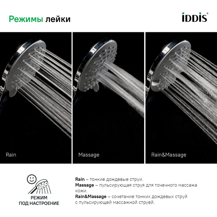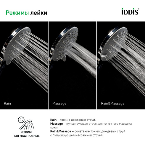Классическое решение для душевой зоны – лейка для душа IDDIS® в цвете хром. Широкий водный купол делает процесс принятия душа более расслабляющим и приятным благодаря большому диаметру диска лейки (115 мм). Разнообразие режимов (Rain, Massage, Rain&Massage) позволяет подобрать вариант под любое настроение: и для бодрящего утра, и для расслабляющего вечера. Для тех, кто выбирает минимализм, простоту и надёжность.