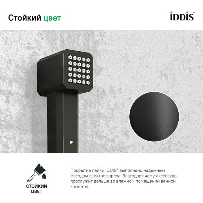 • Цветное покрытие лейки IDDIS® устойчиво к коррозии, появлению царапин, сколов и потускнению.