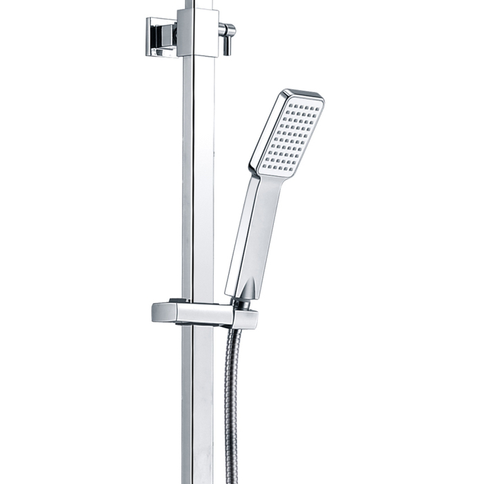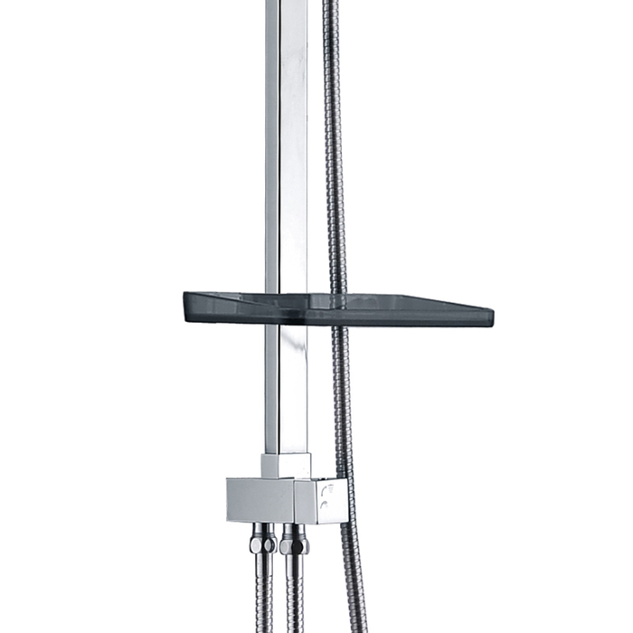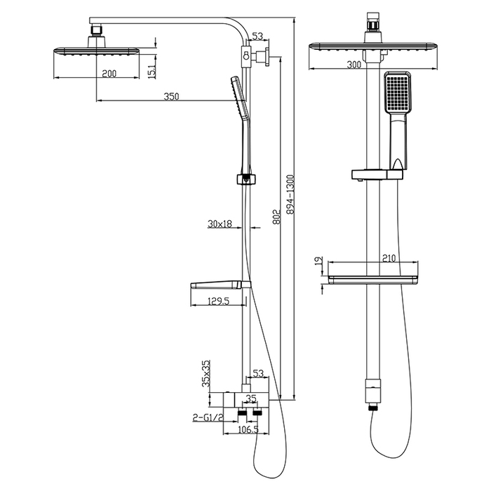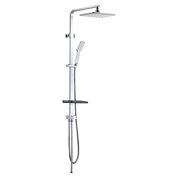 Душевой гарнитур с верхней лейкой. Ручная лейка с 1 режимом (Rain). Стойка: нержавеющая сталь. Размеры леек: верхняя - 300х200 мм, ручная - 64,5 мм; материал леек: ABS-пластик. Шланги: нержавеющая сталь, 1,5 и 0,6 метра, с системами Double Lock и Twist-Free. Телескопическая стойка, высота 894-1300 мм. Поворотный керамический дивертор: три режима (переключалель верхний душ/ручная лейка). В комплекте: крепеж, полка.