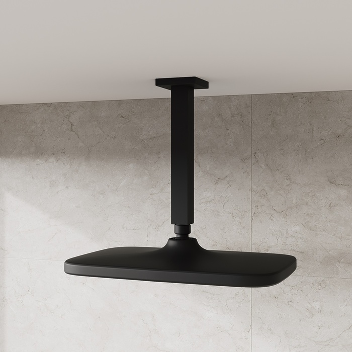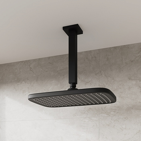 Черная матовая прямоугольная верхняя лейка для тропического душа Esper станет отличным дополнением для встраиваемой душевой системы или заменит надоевшую лейку душевого гарнитура. За счет большого размера лейка создает объемный поток воды, достаточный для комфортного принятия душа. Подходит ко всем кронштейнам со стандартным резьбовым соединением G 1/2”.