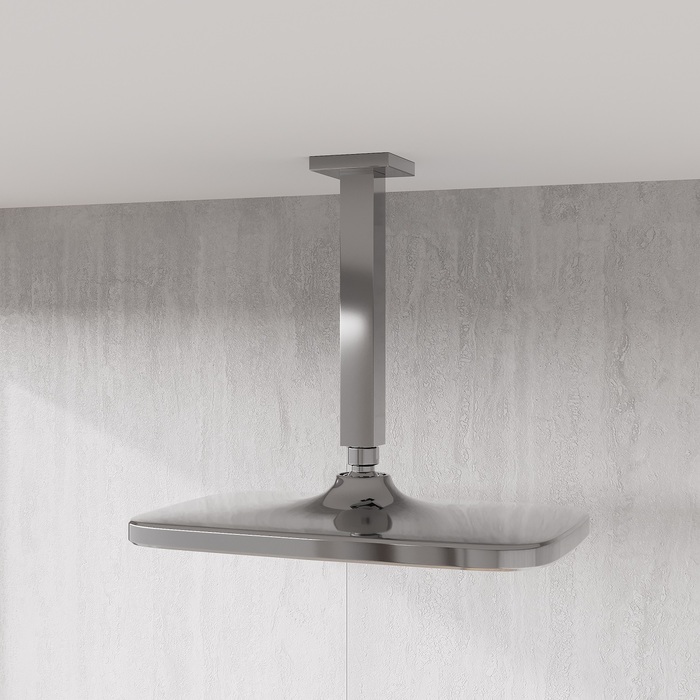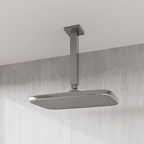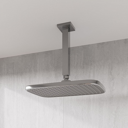Хромированная прямоугольная верхняя лейка для тропического душа Esper с серой лицевой частью станет отличным дополнением для встраиваемой душевой системы или заменит надоевшую лейку душевого гарнитура. За счет большого размера лейка создает объемный поток воды, достаточный для комфортного принятия душа. Подходит ко всем кронштейнам со стандартным резьбовым соединением G 1/2”.