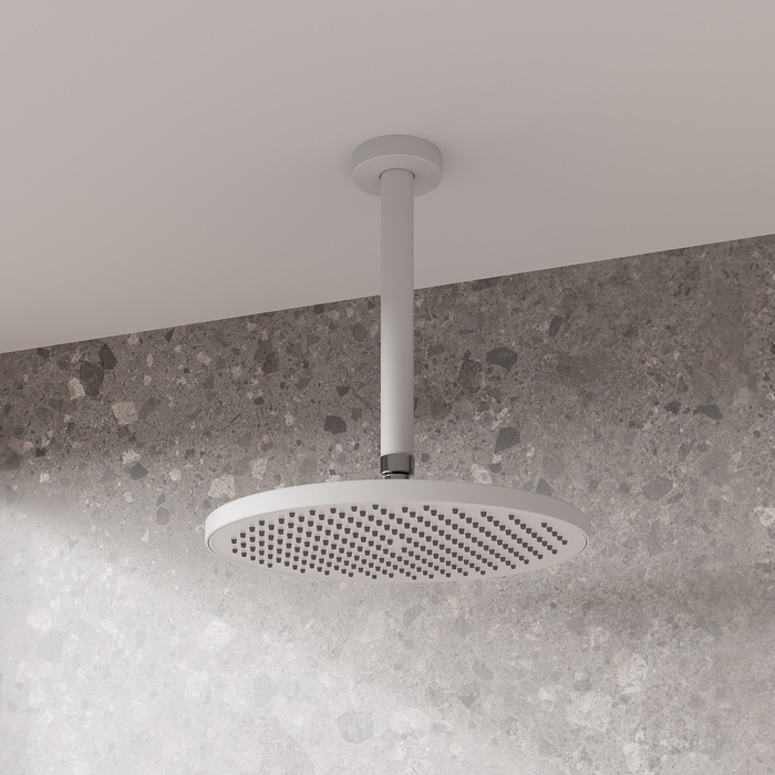 Белая матовая круглая верхняя лейка для тропического душа Esper станет отличным дополнением для встраиваемой душевой системы или заменит надоевшую лейку душевого гарнитура. За счет большого диаметра 256 мм лейка создает объемный поток воды, достаточный для комфортного принятия душа. Подходит ко всем кронштейнам со стандартным резьбовым соединением G 1/2”.