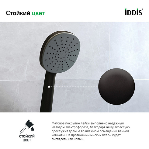 • Матовое покрытие лейки IDDIS® выполнено надежным методом электрофореза, благодаря чему аксессуар прослужит дольше во влажном помещении ванной комнаты. На протяжении многих лет он будет выглядеть как новый.