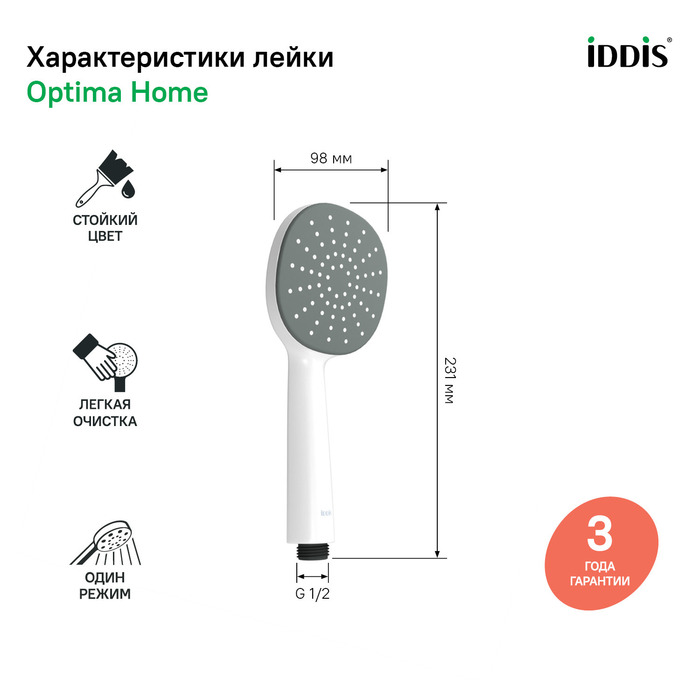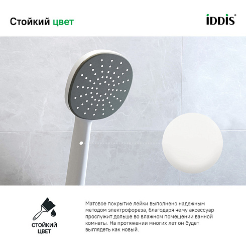 • Матовое покрытие лейки IDDIS® выполнено надежным методом электрофореза, благодаря чему аксессуар прослужит дольше во влажном помещении ванной комнаты. На протяжении многих лет он будет выглядеть как новый.