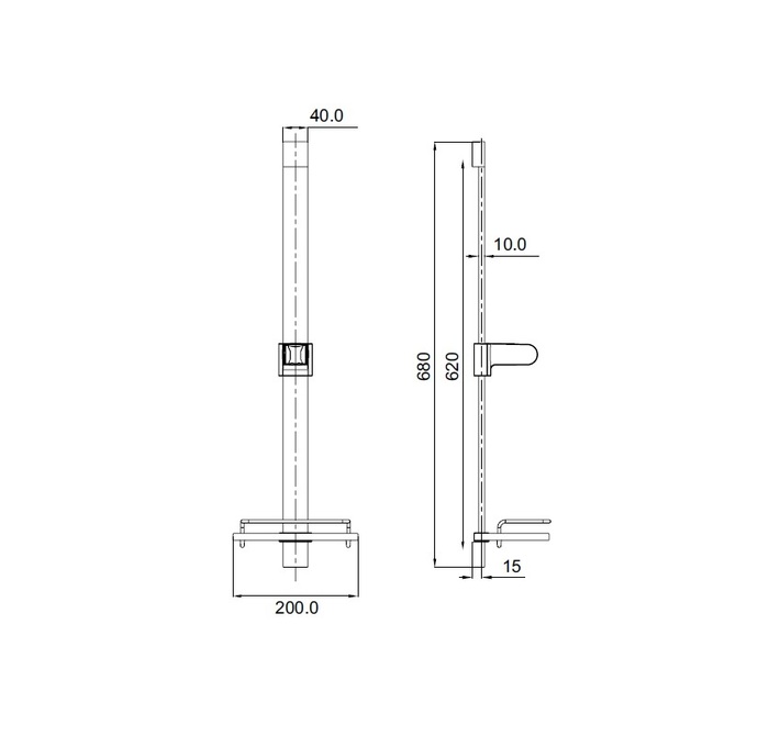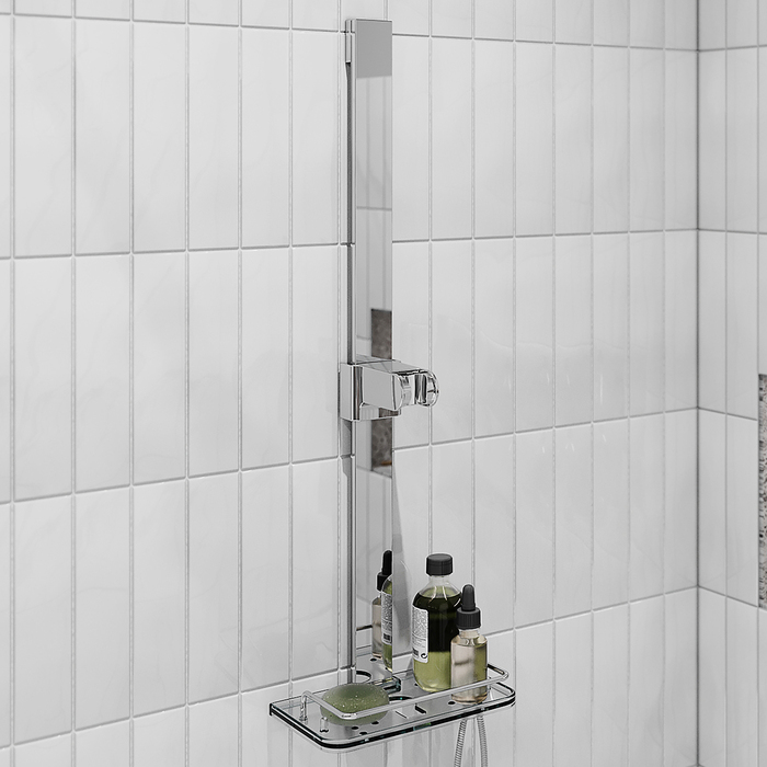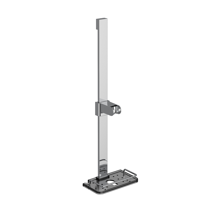 Стойка для душа. Комплектация: полка, держатель лейки, крепления. Материал: нержавеющая сталь. Высота стойки: 68 см, сечение прямоугольное