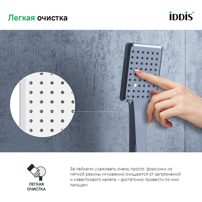 • Лейка для душа IDDIS® имеет классический дождевой режим Rain и легко очищается от известкового налета благодаря эластичным форсункам.