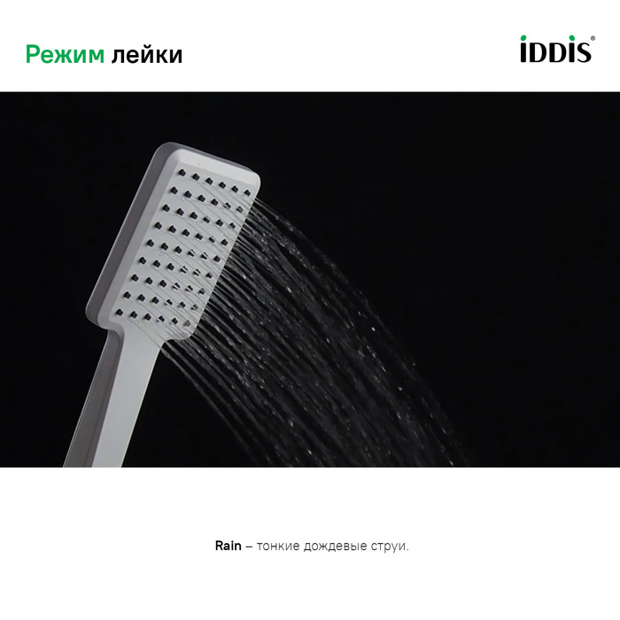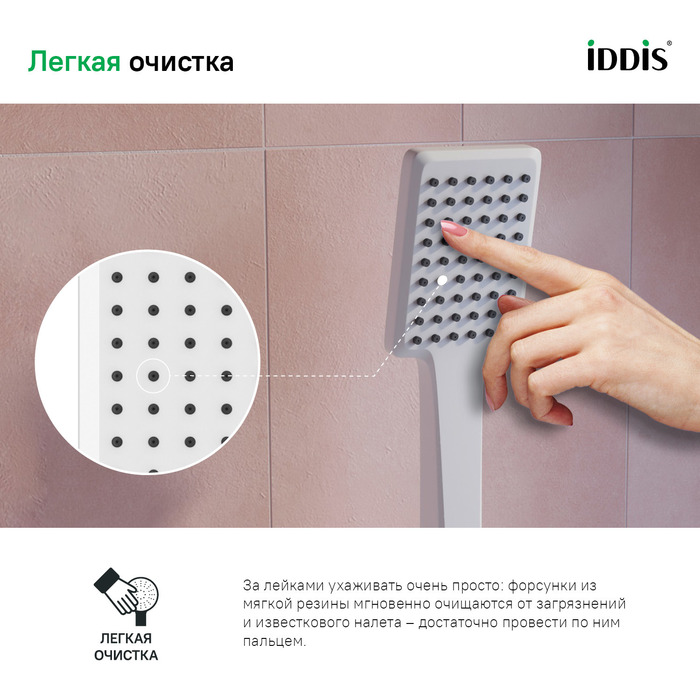 • Душевая лейка IDDIS® имеет классический дождевой режим подачи воды и легко очищается от известкового налета благодаря эластичным форсункам.