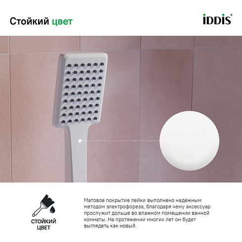 • Лейка для душа IDDIS® выполнена из белого ABS-пластика, устойчивого к воздействию моющих средств и механическим повреждениям. На протяжении многих лет она будет выглядеть как новая.