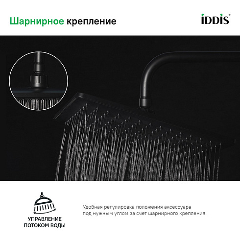 • Насадка может быть установлена как во встраиваемые, так и в навесные душевые системы с помощью кронштейна в тон (например, кронштейна IDDIS® арт. 001BB35i61).
