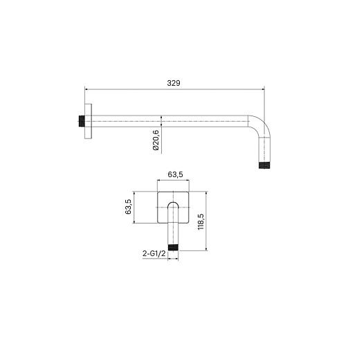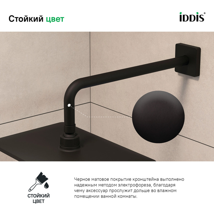 Черный матовый Г-образный настенный кронштейн для верхней душевой лейки. Круглое сечение, длина 329 мм. Совместим с любыми черными верхними лейками IDDIS® с подключением G 1/2, а также с лейками других производителей.