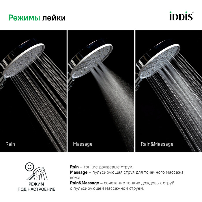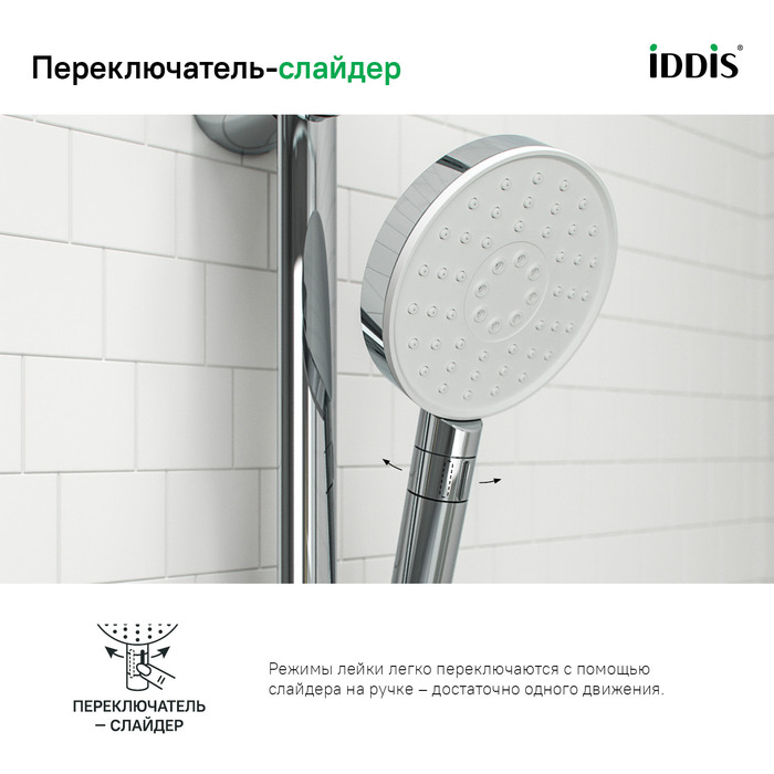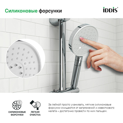 • За лейкой IDDIS® ухаживать очень просто: мягкие форсунки мгновенно очищаются от загрязнений и известкового налета – достаточно провести по ним пальцем.