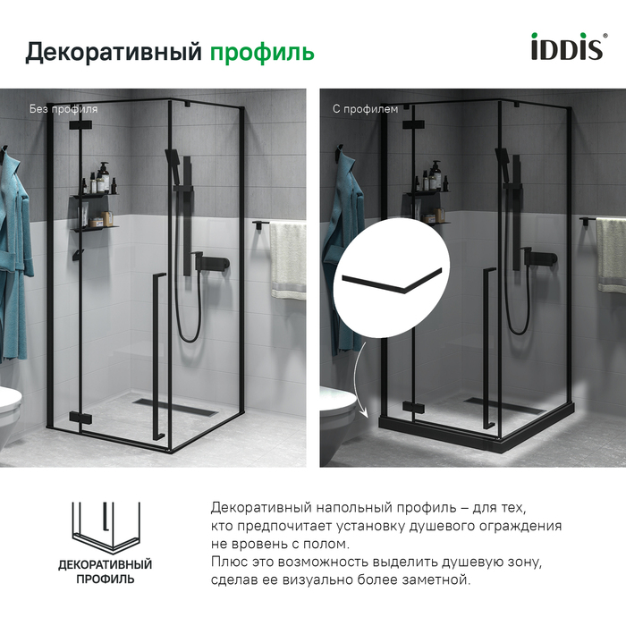 Декоративный напольный профиль – решение для тех, кто предпочитает установку стеклянного душевого ограждения не вровень с полом. Позволяет визуально выделить душевую зону и сделать ее более завершенной и эстетичной.