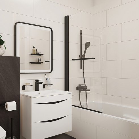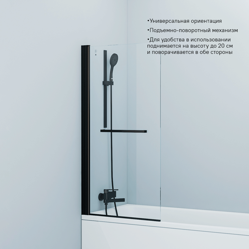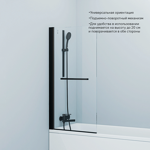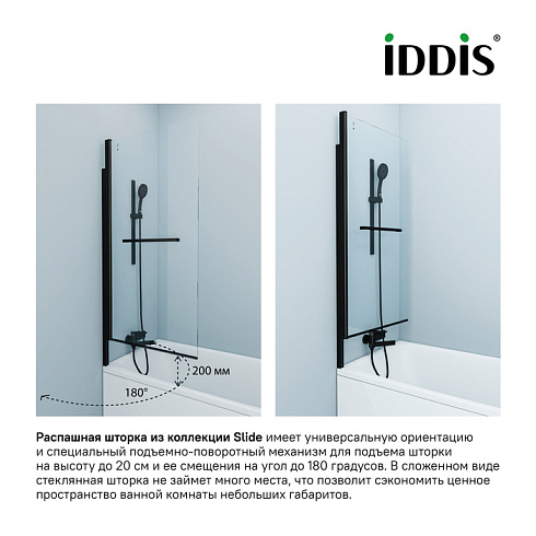 Стеклянная шторка Slide с профилем стильного черного цвета — изящное и невесомое решение для любой современной ванной, в том числе для самых компактных пространств. Имеет универсальную ориентацию и удобный регулируемый размер 750-765х1400 мм, позволяющий сгладить неровность стен до 15 мм. В сложенном виде распашная шторка не займет много места благодаря специальному подъемно-поворотному механизму, обеспечивающему подъем шторки на высоту до 20 см и ее смещение на угол до 180 градусов.