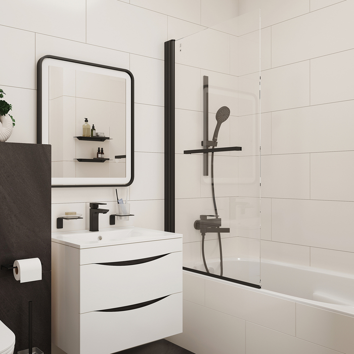 • Прозрачное закаленное стекло толщиной 5 мм выдерживает случайные удары, что делает шторку надежной и безопасной в каждодневном использовании.