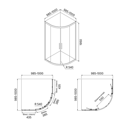 Душевое ограждение для ванной комнаты Zodiac в форме четверти круга с регулируемым размером 985-1000х985-1000х1950 мм, что позволяет сгладить неровности стен до 15 мм.