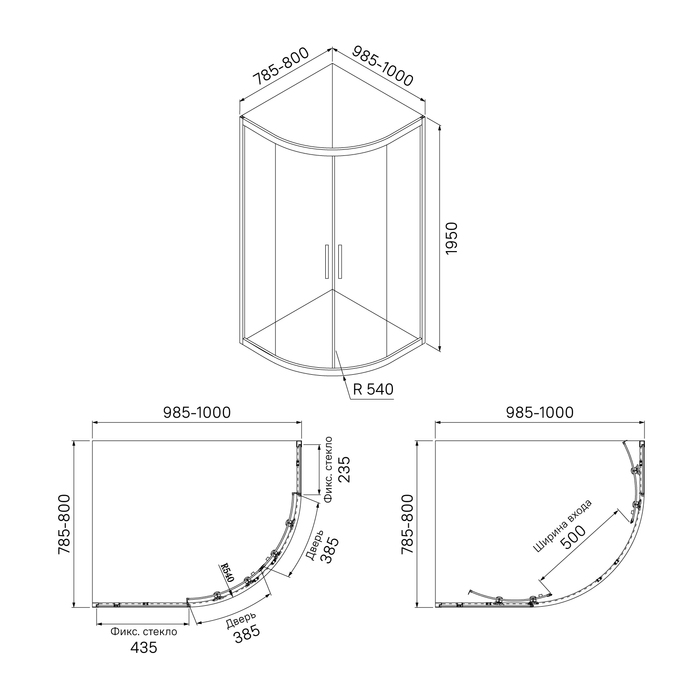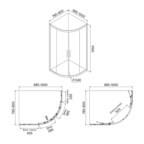 Душевое ограждение для ванной комнаты Zodiac асимметричной округлой формы с регулируемым размером 985-1000х785-800х1950 мм, что позволяет сгладить неровности стен до 15 мм.