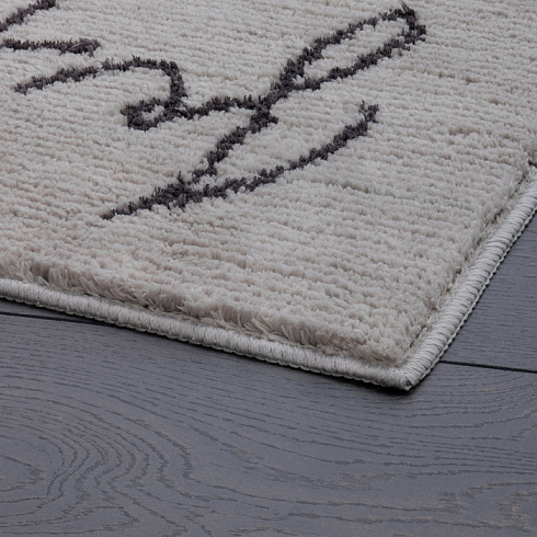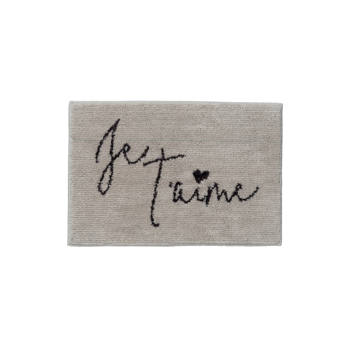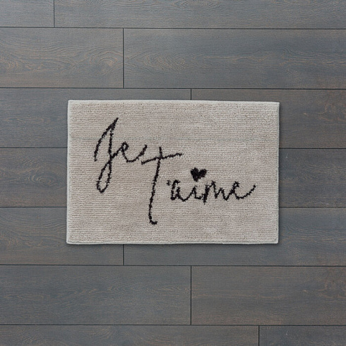 Коврик для ванной бежевого цвета с невысоким ворсом (1 см), мягкий и очень приятный на ощупь. Вдохновляющая надпись на французском языке «Je t’aime», что значит «Я люблю тебя». Ворс из микрофибры отлично держит форму, легко чистится и быстро сохнет. Коврик подойдет для ванной и туалета.