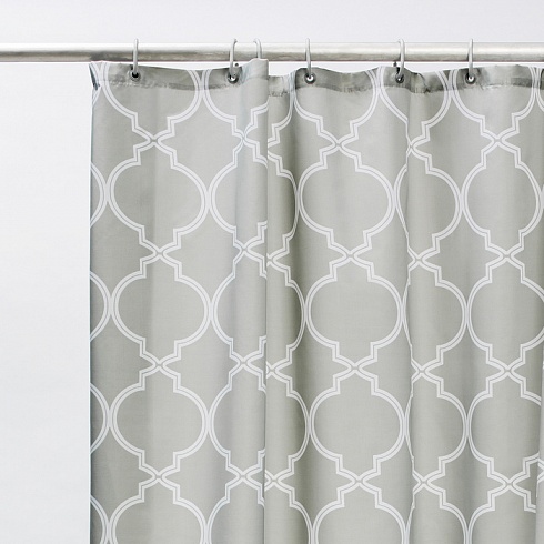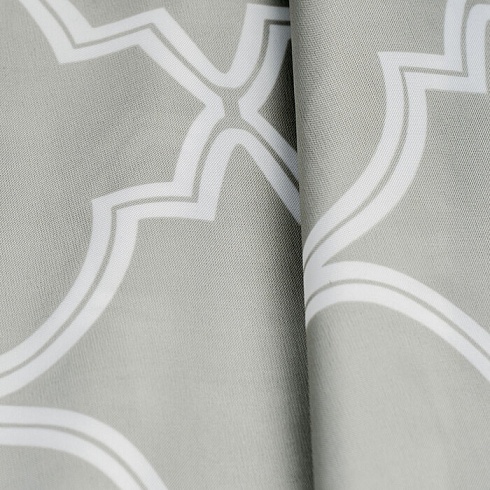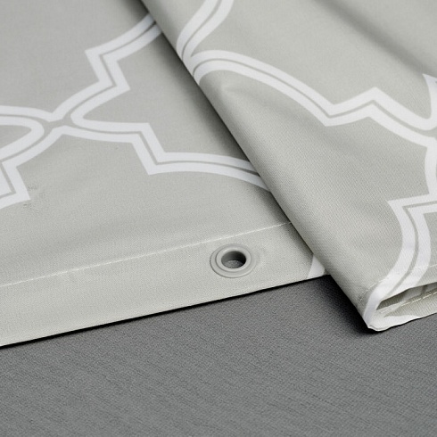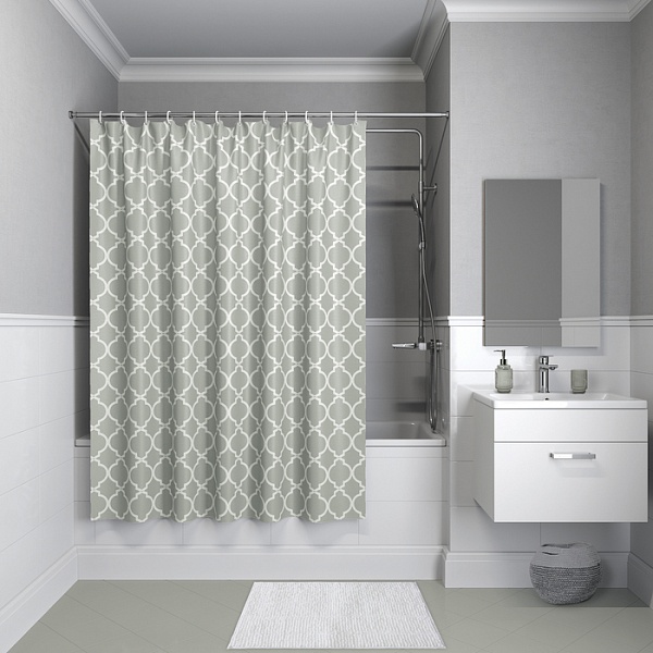 Непрозрачная штора для ванной благородного серого оттенка с белым узором. Штора изготовлена из полиэстера с красивой атласной текстурой и деликатным блеском.